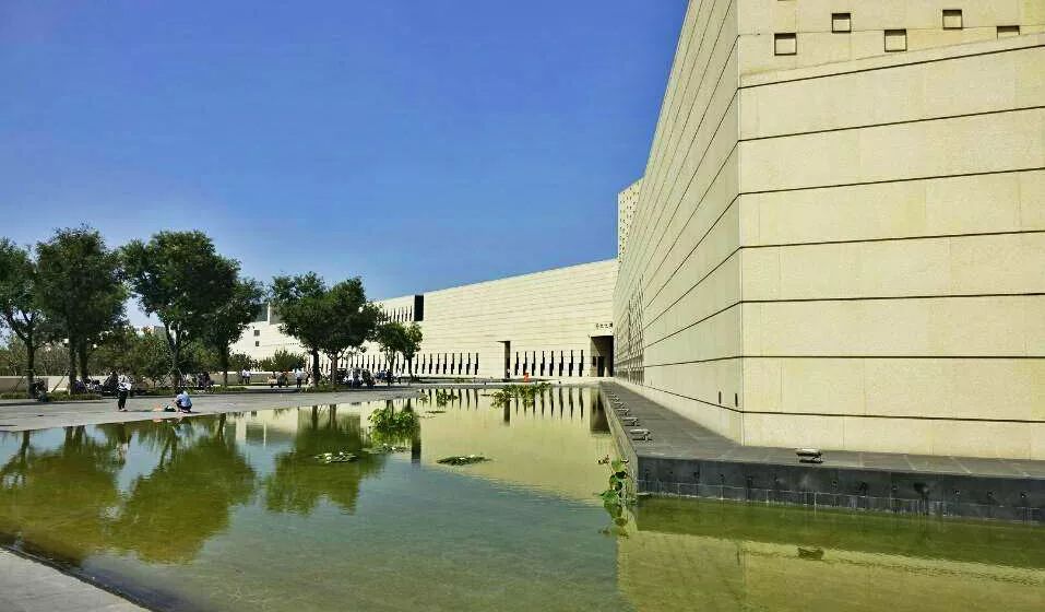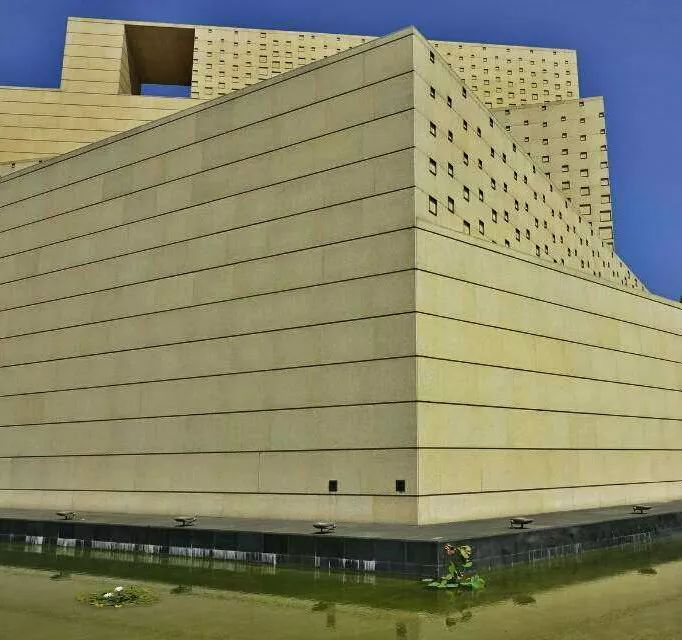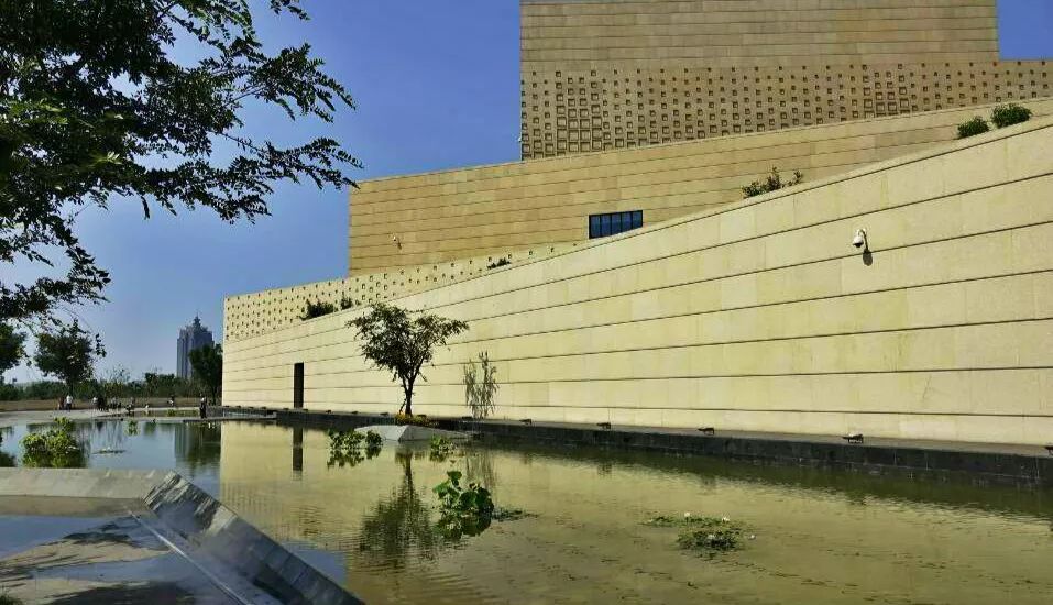 博物館整個建築外型以立體幾何的不規則組合進(jìn)行創意表達,陽光照射之下,米黃的牆面(miàn)倒影水中,遠看一派恢宏壯闊,給人身臨法國(guó)羅浮宮的錯覺。
