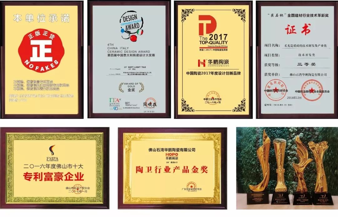 除擁有雄厚的資本實力外,柔光磚·華鵬陶瓷還(hái)榮獲陶瓷行業唯一“中意陶瓷設計大賽金獎”、“中國(guó)建材家居企業100強”、“陶瓷行業名牌産品”、“陶衛行業産品金獎”、等多項殊榮,完善各項國(guó)内外資質認證,爲工程項目提供信譽保障!