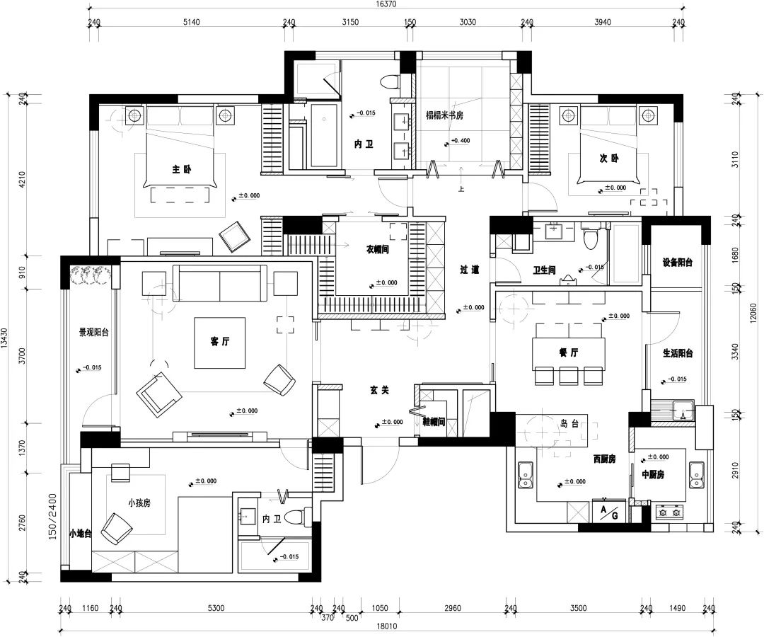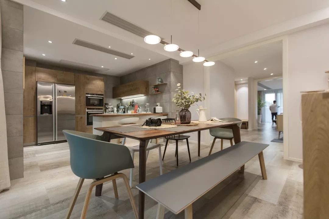 因爲本案是一個熱愛旅行和美食的家庭,所以在布局上以廚房和餐廳作爲整個家的核心。整個廚房空間被設計師劃分爲中式廚房和西式廚房,既滿足了主人對(duì)不同美食的喜愛,也可以讓整個空間充滿家的味道(dào)。