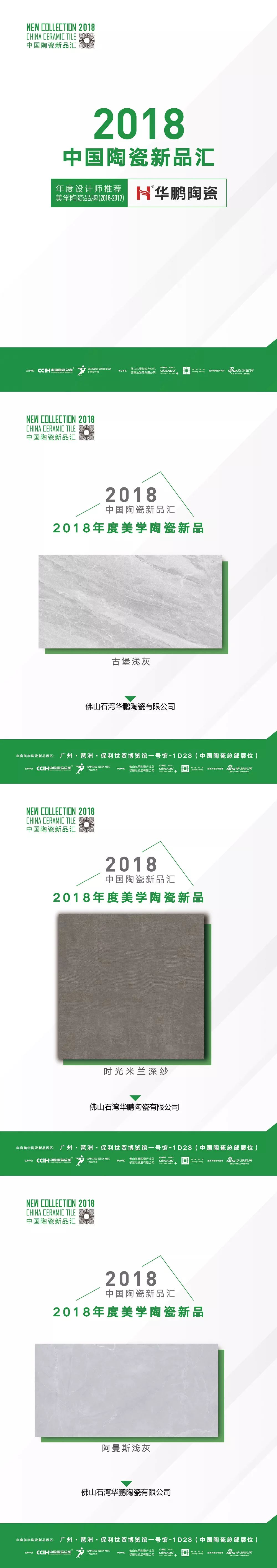 在經(jīng)過(guò)5位評審導師及百名設計師的網絡評選,華鵬陶瓷從衆多品牌中脫穎而出,榮獲“設計師推薦美學(xué)陶瓷品牌(2018-2019)”,并憑借參選産品“古堡淺灰、時(shí)光米蘭深紗、阿曼斯淺灰”榮獲“2018年度美學(xué)陶瓷新品”殊榮!