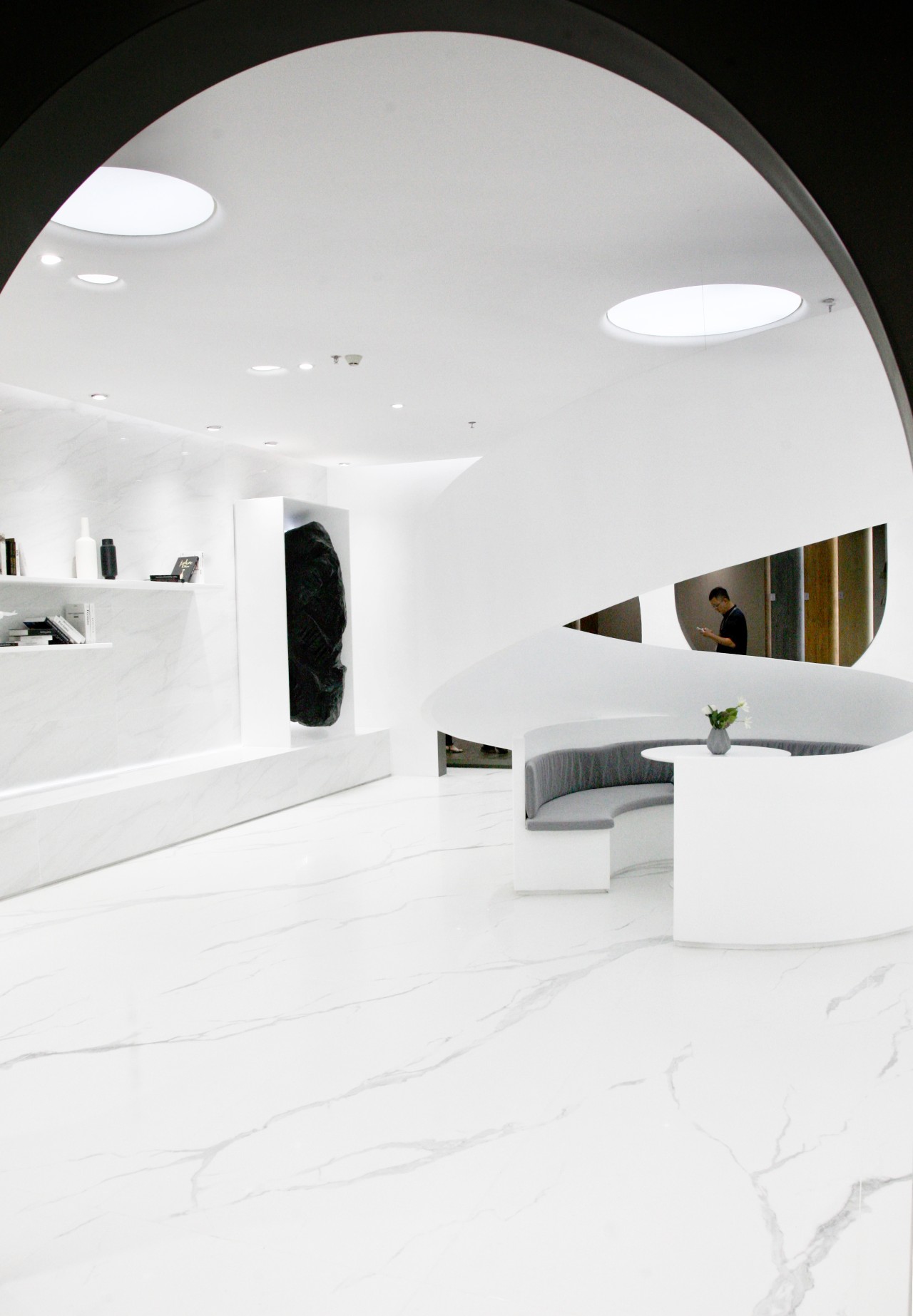 展廳的造型創意方面(miàn),結合華鵬“柔”的産品屬性,采用曲線、圓弧作爲空間造型創意元素