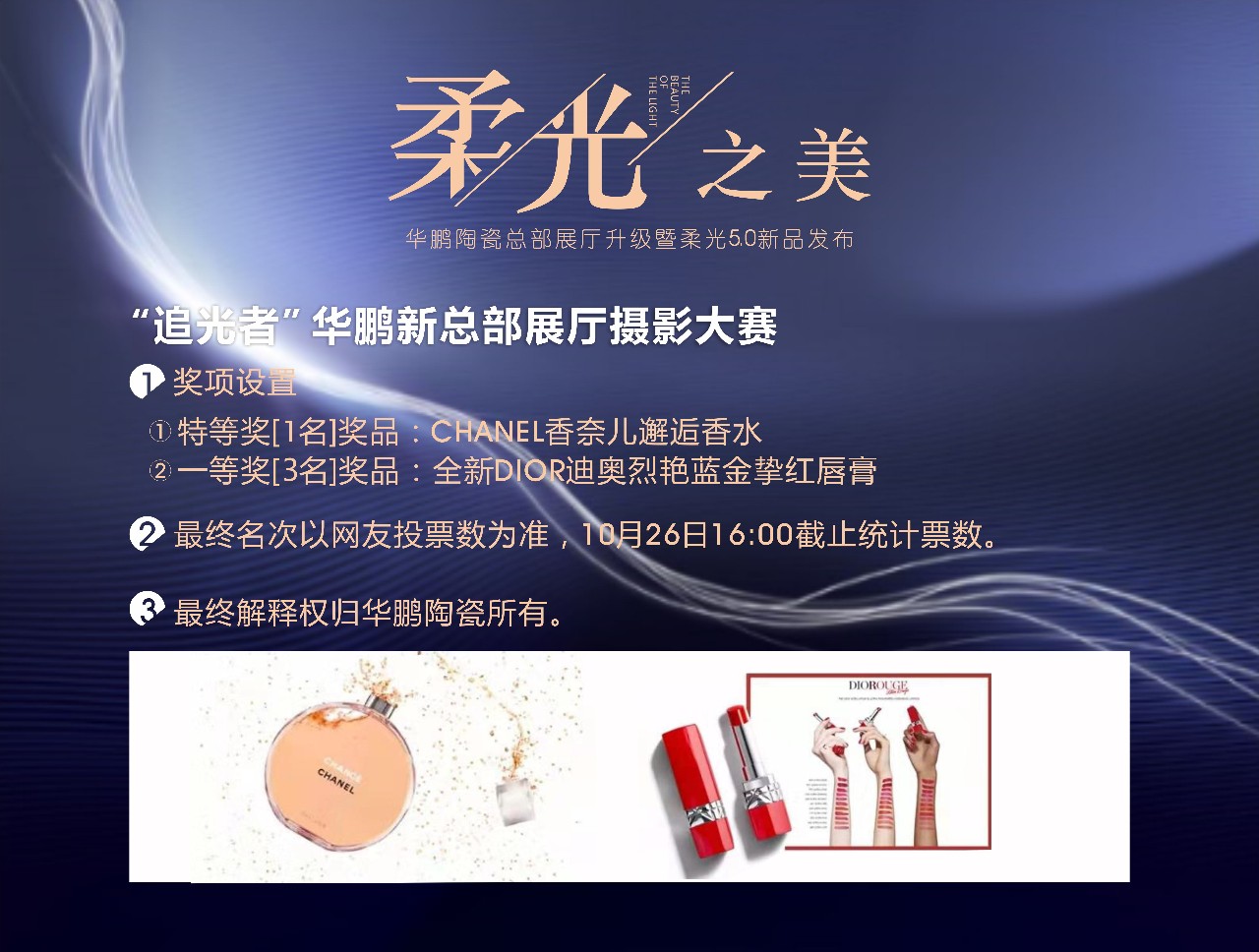10月17日,華鵬陶瓷柔光5.0奢石系列新品全球發(fā)布,華鵬新總部展廳也正式同步對(duì)外開(kāi)放,“追光者”華鵬新總部展廳攝影大賽同期舉行。