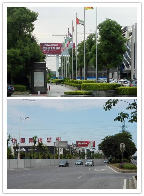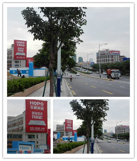 中國(guó)陶瓷總部東門兩(liǎng)塊黃金位置對(duì)牌高炮廣告位,遙相呼應視覺效果非常醒目,華鵬陶瓷品牌宣傳新形象閃亮登場。