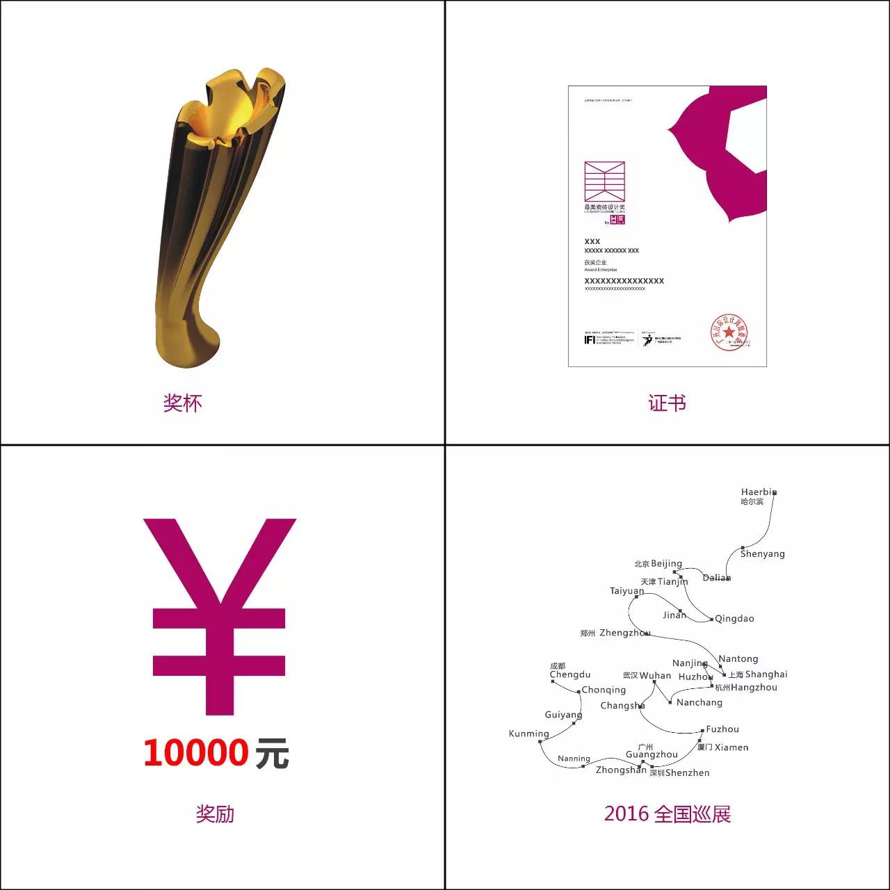 同時(shí)對(duì)獲獎作品進(jìn)行生産轉化爲瓷磚産品,并于2015廣州國(guó)際設計周展會(huì)設置展示專區,面(miàn)向(xiàng)來自全國(guó)逾100000人次的甲方業主、設計師、渠道(dào)商、媒體人士等進(jìn)行發(fā)布推廣。另外,主辦方還(hái)將(jiāng)于2016年在全國(guó)範圍内開(kāi)展“最美瓷磚設計獎”獲獎作品的巡回推廣活動。