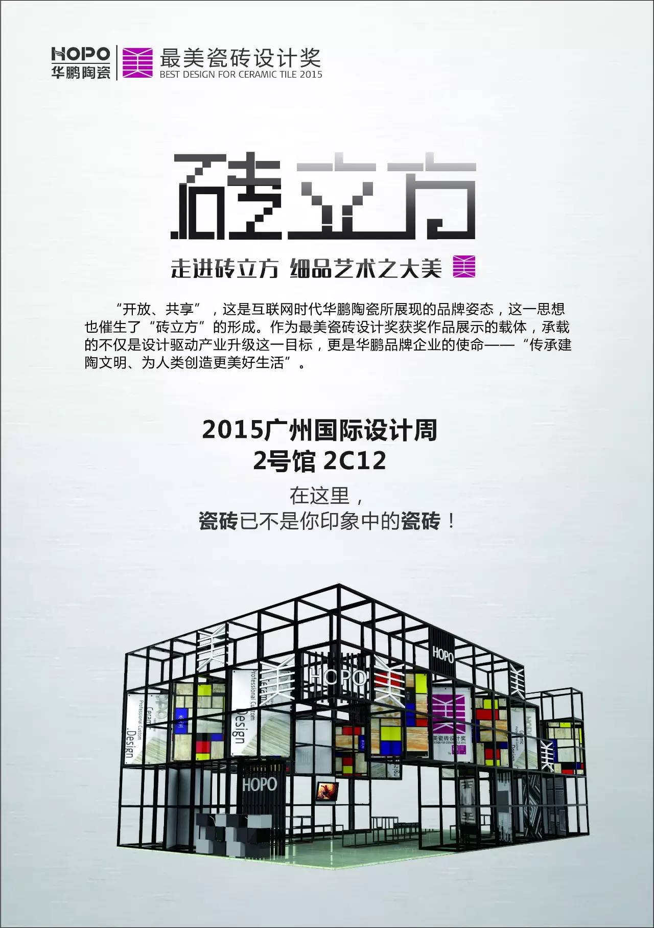 2015年12月4日-6日,廣州設計周將(jiāng)在廣州琶洲保利世貿博覽館如期舉辦。展會(huì)以“拾零”爲策展主題,由“藝術與設計、家居與生活方式、建築裝飾材料、商業與辦公環境”四大展覽組成(chéng),吸引了來自全球的300多家設計、材料、家居品牌企業和組織機構參展,展覽規模近50000㎡,預計到場專業觀衆逾10萬人次。2号館2C12華鵬陶瓷磚立方,敬候您的光臨。
