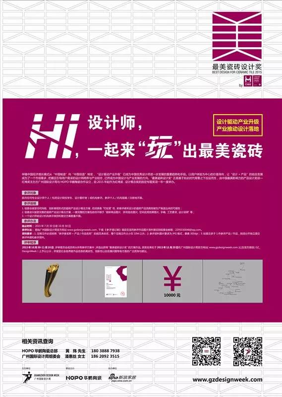 最美瓷磚設計獎征稿開(kāi)始啦!隻要你熱愛設計,敢想敢做,就(jiù)快點加入到我們中來吧!面(miàn)向(xiàng)全國(guó)專業設計師個人(包括設計院校學(xué)生、設計愛好(hǎo)者)或機構征集“你眼中”的适于中國(guó)人居生活空間的“最美瓷磚”産品設計概念方案, “設計+産業”結合搭建孵化平台,迎合中國(guó)消費“美”的時(shí)代來臨。