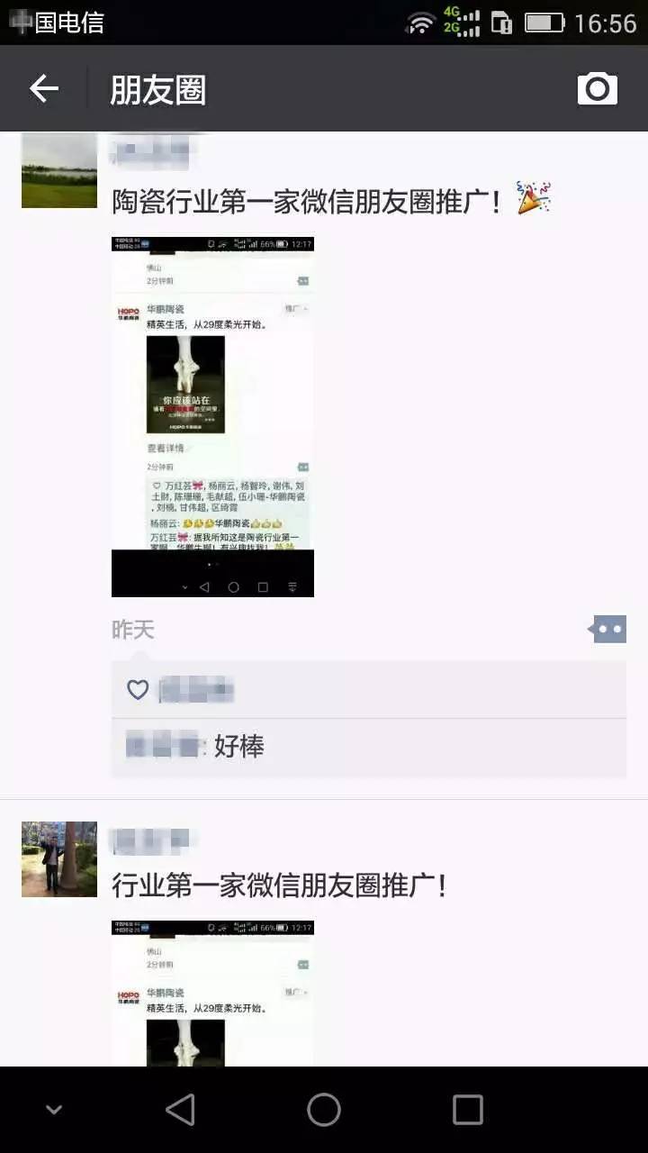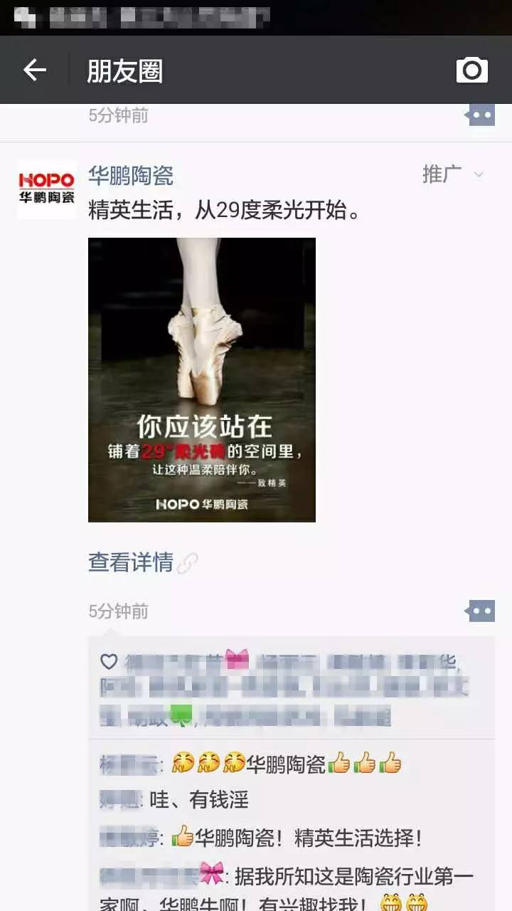 然而,2月22日,第一家投放微信朋友圈廣告的陶瓷企業出現了,華鵬陶瓷。它迅速成(chéng)爲了大家的議論熱點,刷爆朋友圈。