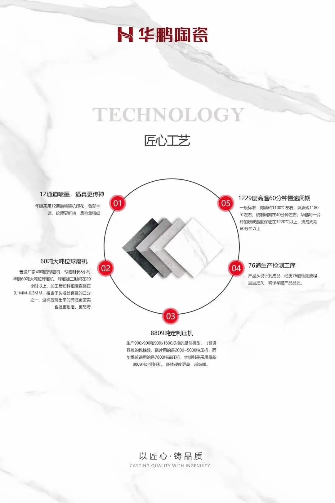 華鵬陶瓷一直堅持匠心品質,每一片産品都(dōu)曆經(jīng)8809噸定制壓機,1229度高溫,60分鍾燒成(chéng)周期,76道(dào)生産檢驗程序,确保産品高品質,有著(zhe)對(duì)現代制造工藝精神的執著(zhe)與不懈追求,背後(hòu)都(dōu)隐藏著(zhe)極緻的初心。
