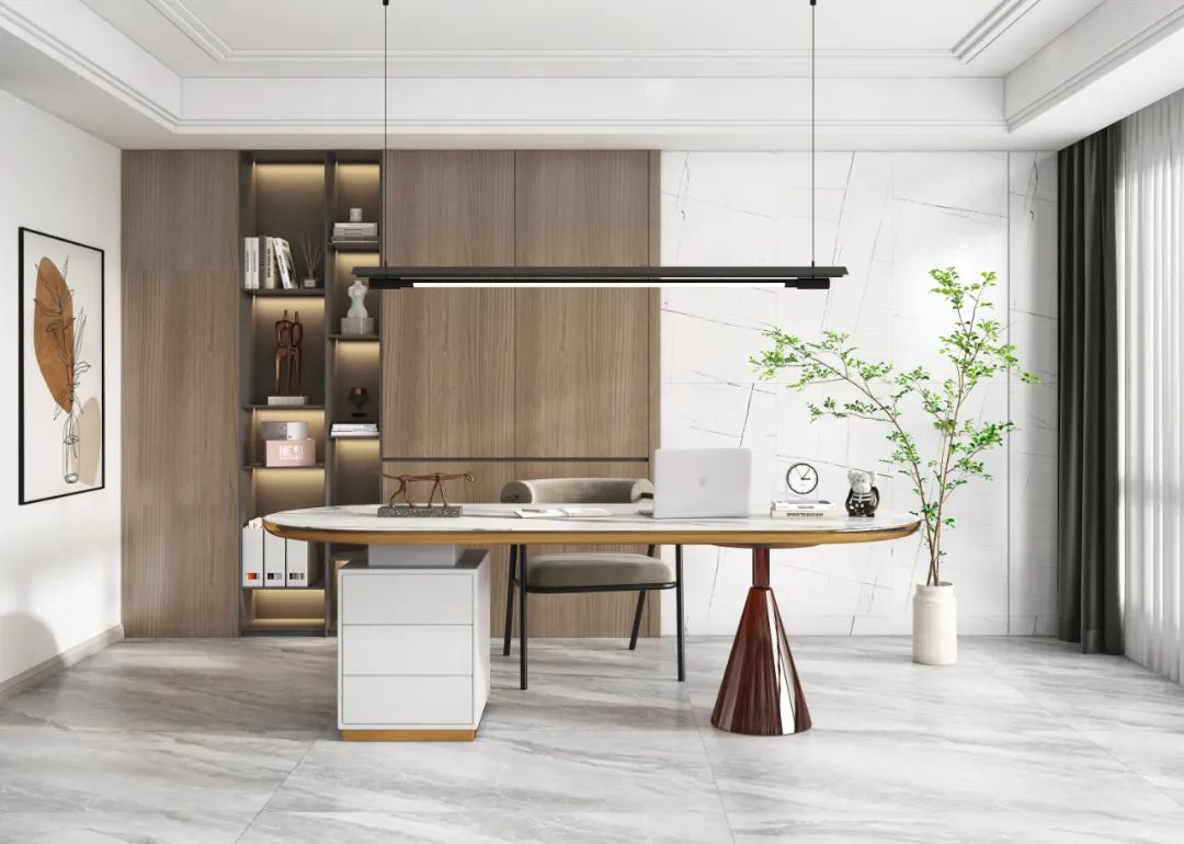 書房以虛實結合的體塊感呈現,疏密不一,個性背景牆在橫縱間碰撞交錯,演繹靈動随性之美,踱入書房,這(zhè)一隅是閱讀、辦公最好(hǎo)的的靜谧空間。