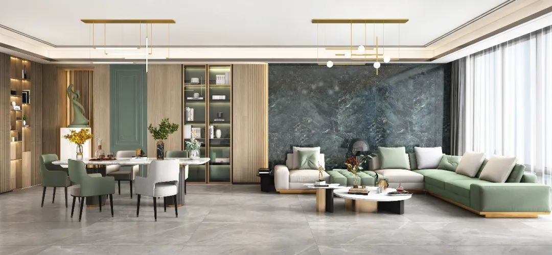 空間整體以沉穩色系爲背景,營造出現代簡約的氣質,29°柔光磚通鋪延伸視覺,溫馨的豆沙綠點綴其中,與空間基底形成(chéng)鮮明對(duì)比,引發(fā)出空間的張力,同時(shí)也爲空間注入一絲躍動,豐富了空間的層次與表情。