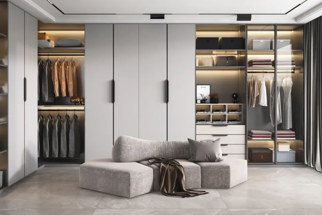 主卧灰色的沙發(fā)家具讓空間更爲感性,輔以柔和的瓷磚色調元素,穩重了整體基調,相得益彰,呈現了一個時(shí)尚、簡約的空間氛圍。