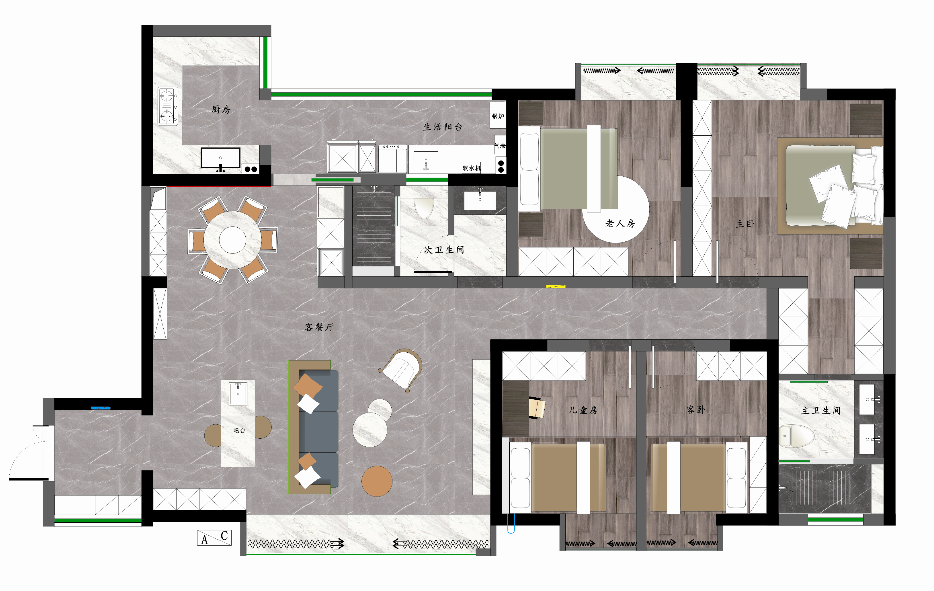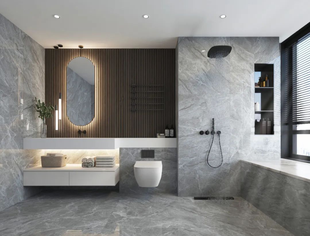 主衛采用大面(miàn)積的灰色調彰顯空間的氛圍感,也延伸了視覺感,在木色鏡子的闌珊格的加持下,讓空間的層次更加豐富,觥籌交錯透露著(zhe)品質和追求。