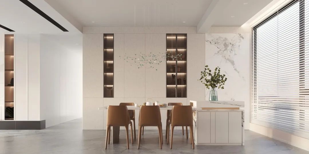 中島台搭配白色大理石餐桌,大度簡約,兼具設計感與實用性,通過(guò)白色與灰色穿插,深淺對(duì)比帶來層次的變化,讓空間細膩而有溫情。