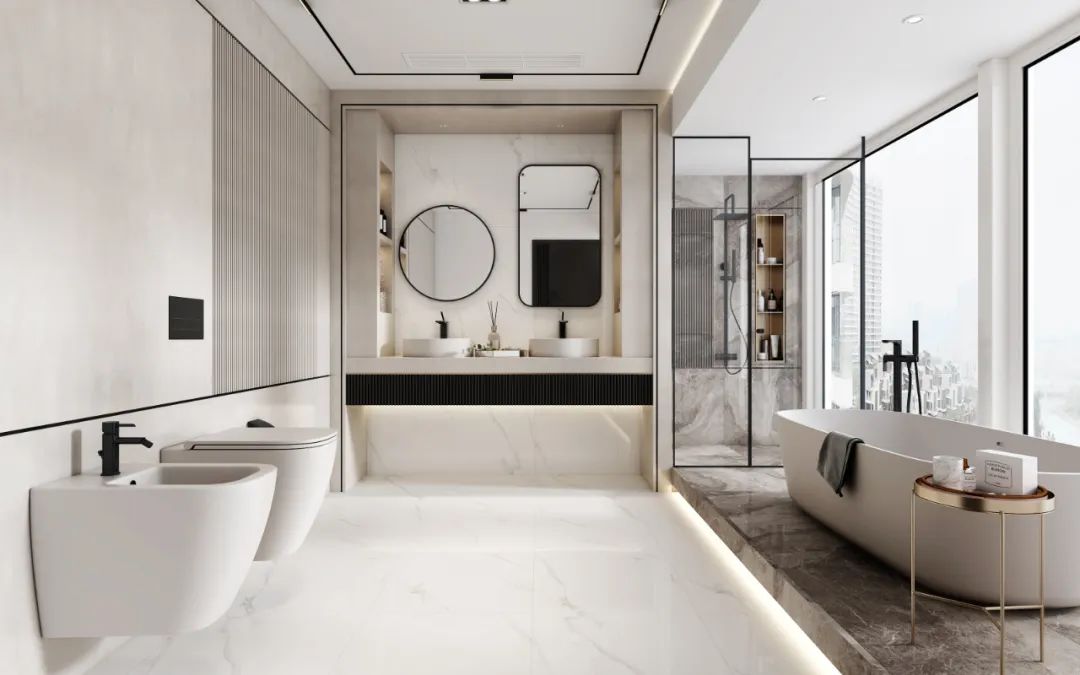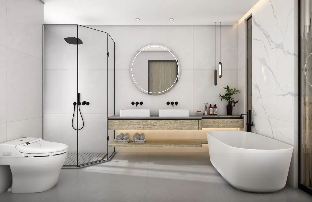 衛生間被劃分爲一個大容量區域。這(zhè)樣一個大區域看上去更大方美觀,灰色瓷磚與金屬質感帶來的強烈現代感被木質恰到好(hǎo)處的糅合,大型浴缸可以産生更快的優雅沐浴感受,主衛生間的功能(néng)分區設計十分高效暢達。