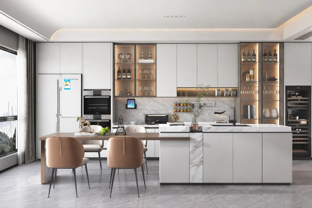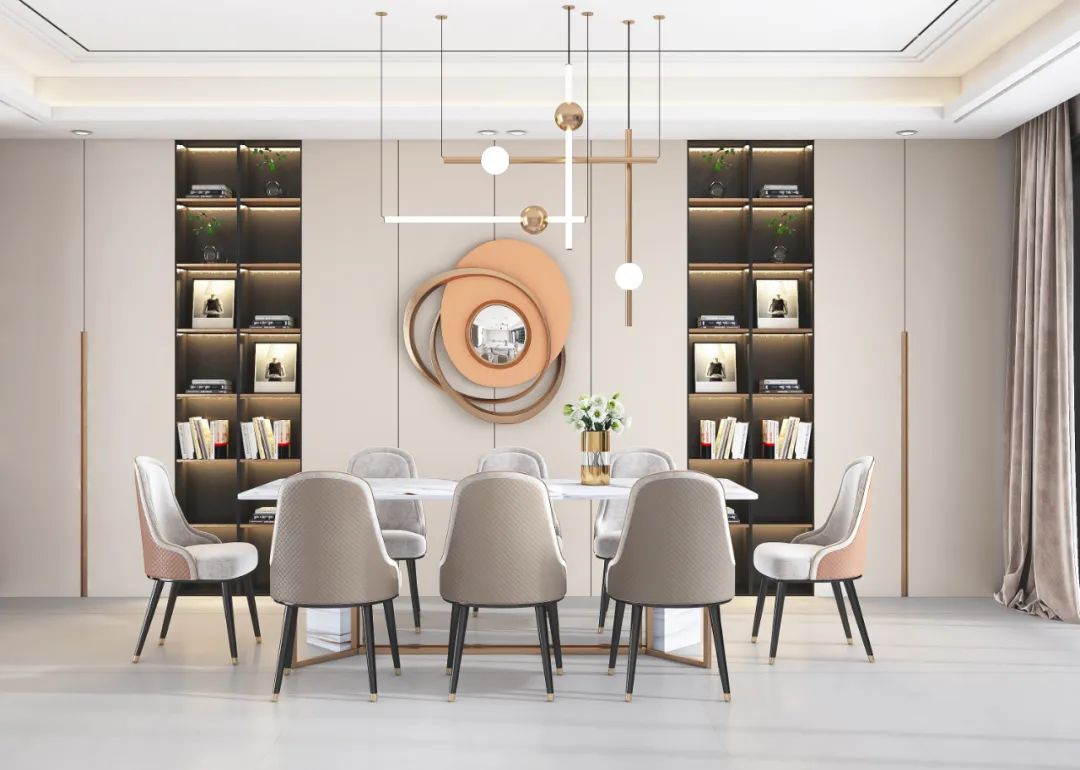 餐廚設計中西合璧,爲主人營造出一種(zhǒng)營造良好(hǎo)的用餐氛圍。時(shí)尚質感的餐桌椅和餐邊櫃設計,反而在圓形藝術品的烘托下,賦予了餐廳和諧的氛圍和格調,流露出輕奢不凡的氣質。