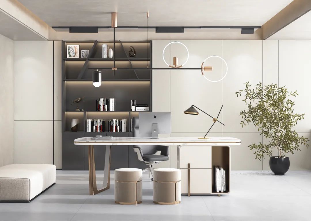 書房中以素色爲基礎,氣質拿捏到位。一株郁郁蔥蔥的綠植讓人擁有舒适的心情,造型感十足的吊燈爲空間增添了些許設計感。