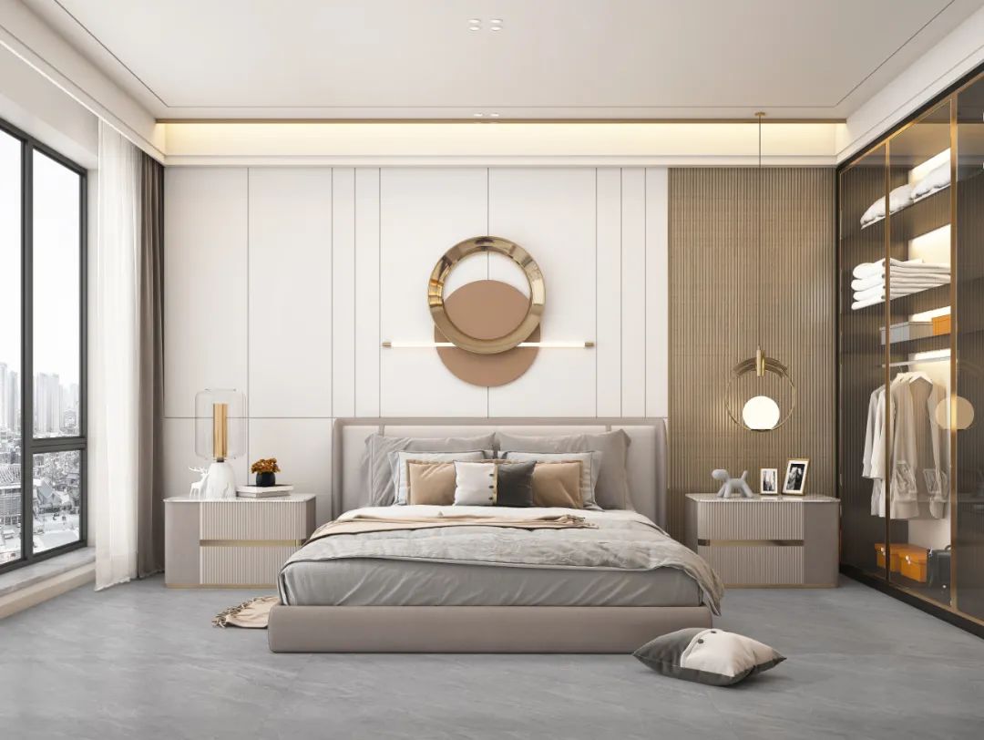 卧室則同樣延續空間主打色,背景牆也大緻相同,保留空間的通透流暢。搭配金屬玻璃衣櫥,既突出了空間的質感,也使其感覺并不過(guò)于冷清,低調