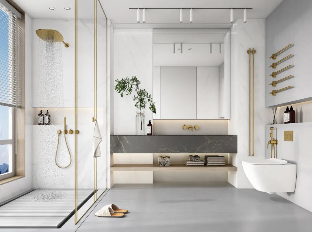 整個衛浴間幹濕分離,以淺灰作爲主色調,營造精緻與時(shí)尚的視覺感受,極簡的設計展現出了現代主義的高度理性,減少了陳設的構成(chéng)元素,整個空間簡潔而素雅。