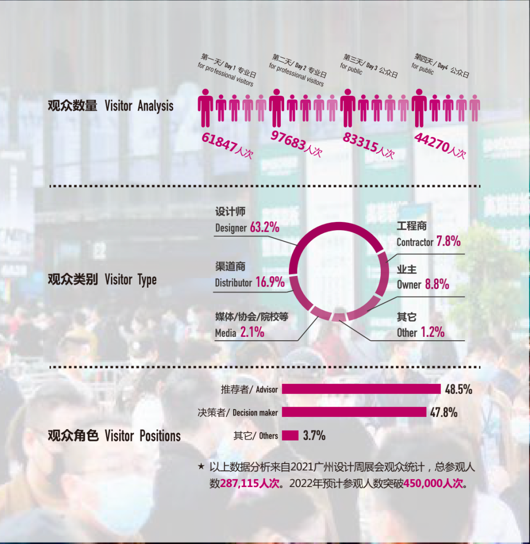 2021廣州設計周展覽規模擴增至18萬㎡,四天展會(huì)的參觀人數超預期達287,115人次,展覽以“當代人居生活美學(xué)新業态的設計+選材”爲方向(xiàng),聯動“廣州保利世貿博覽館、廣州國(guó)際采購中心、南豐國(guó)際會(huì)展中心“三館同期舉辦,史無前例的展覽規模和火爆人氣,使廣州設計周成(chéng)爲全國(guó)唯一規模不減反增的設計大展,再次穩居中國(guó)目前規模最大、參與人數最多、影響力最廣的設計産業年度營商大展。
