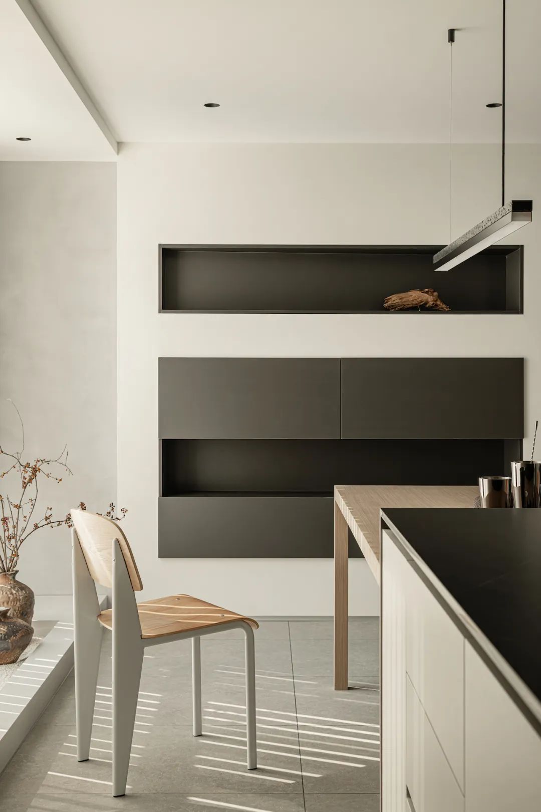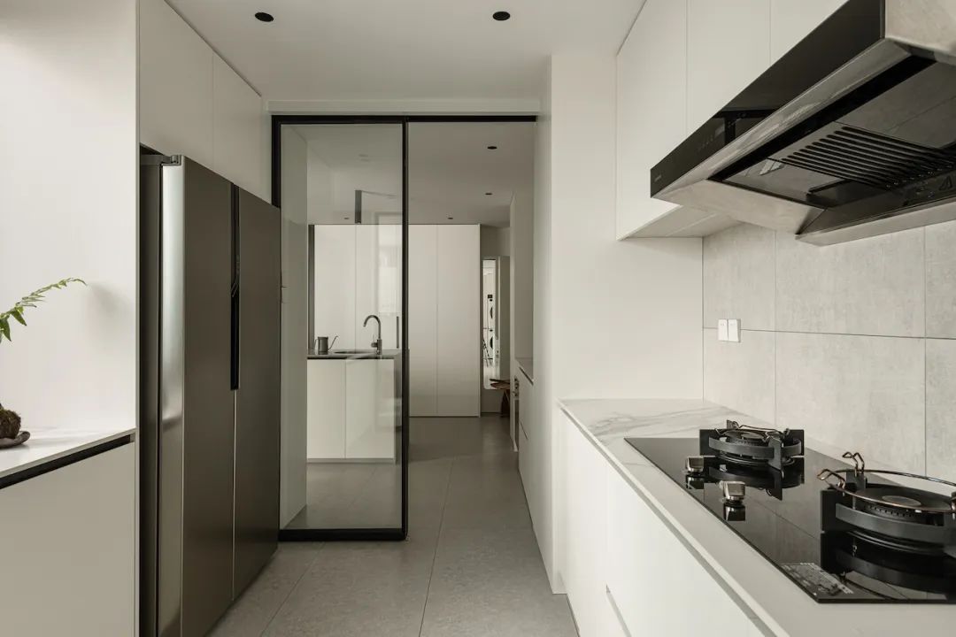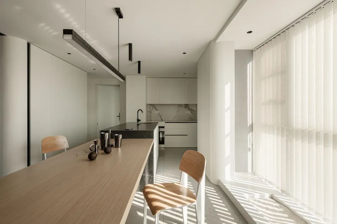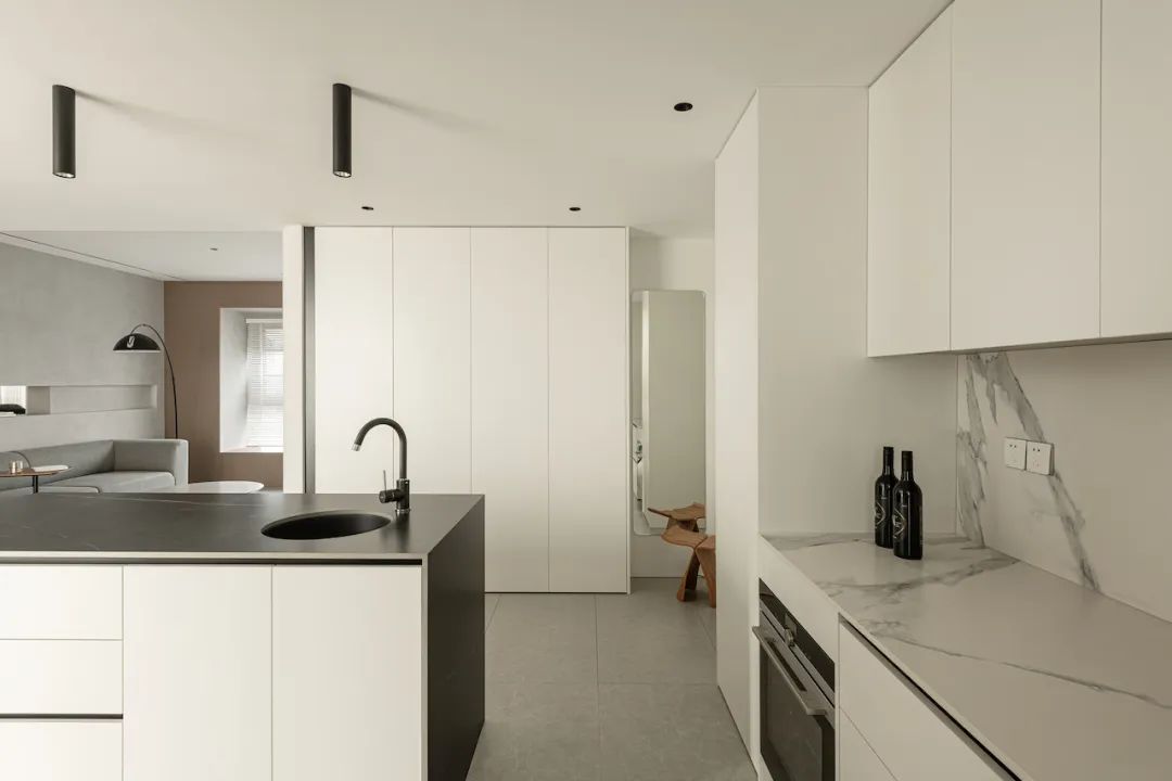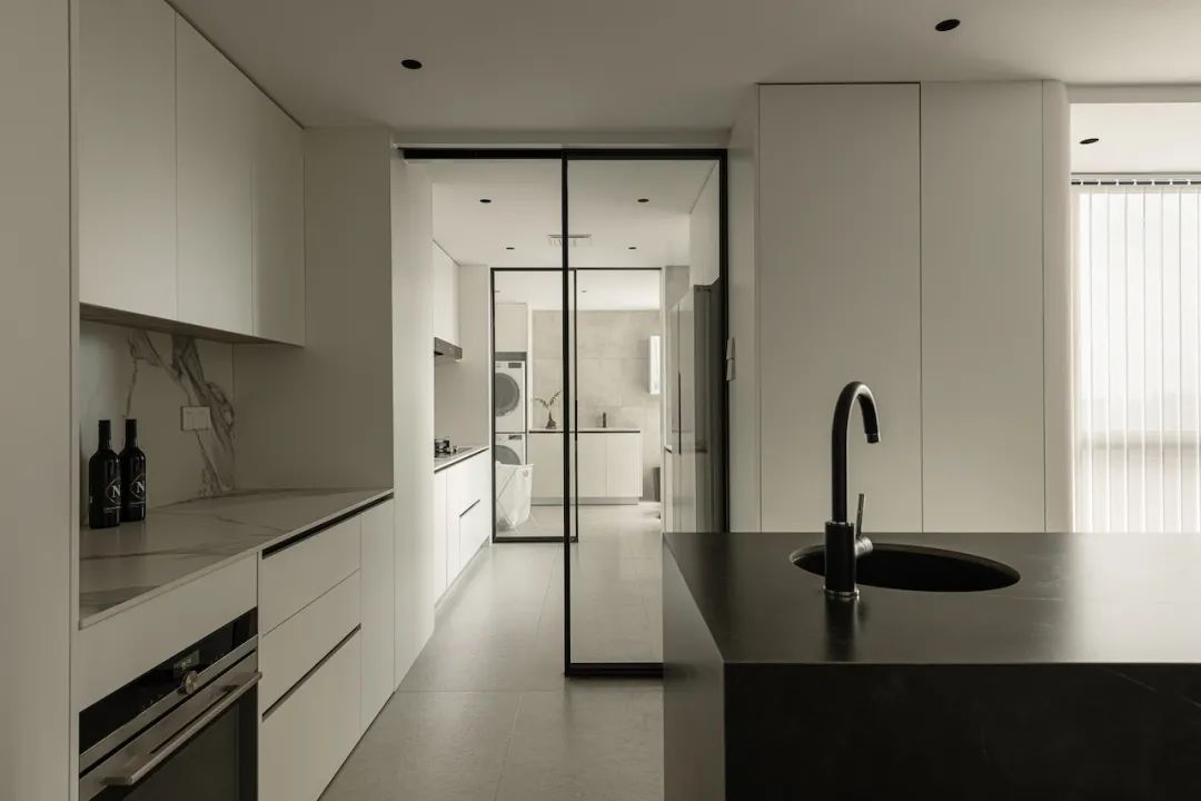 廚房的設計延續極簡的風格,白色的櫥櫃與黑色島台相搭配,兼具美觀性與實用性,細膩的紋理提升了整體空間的質感。利落的線條爲空間帶來極緻舒适的感受,簡潔的色彩高級又耐看。