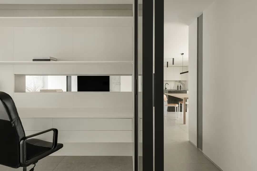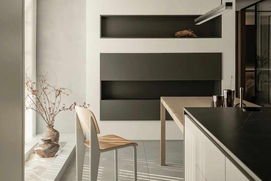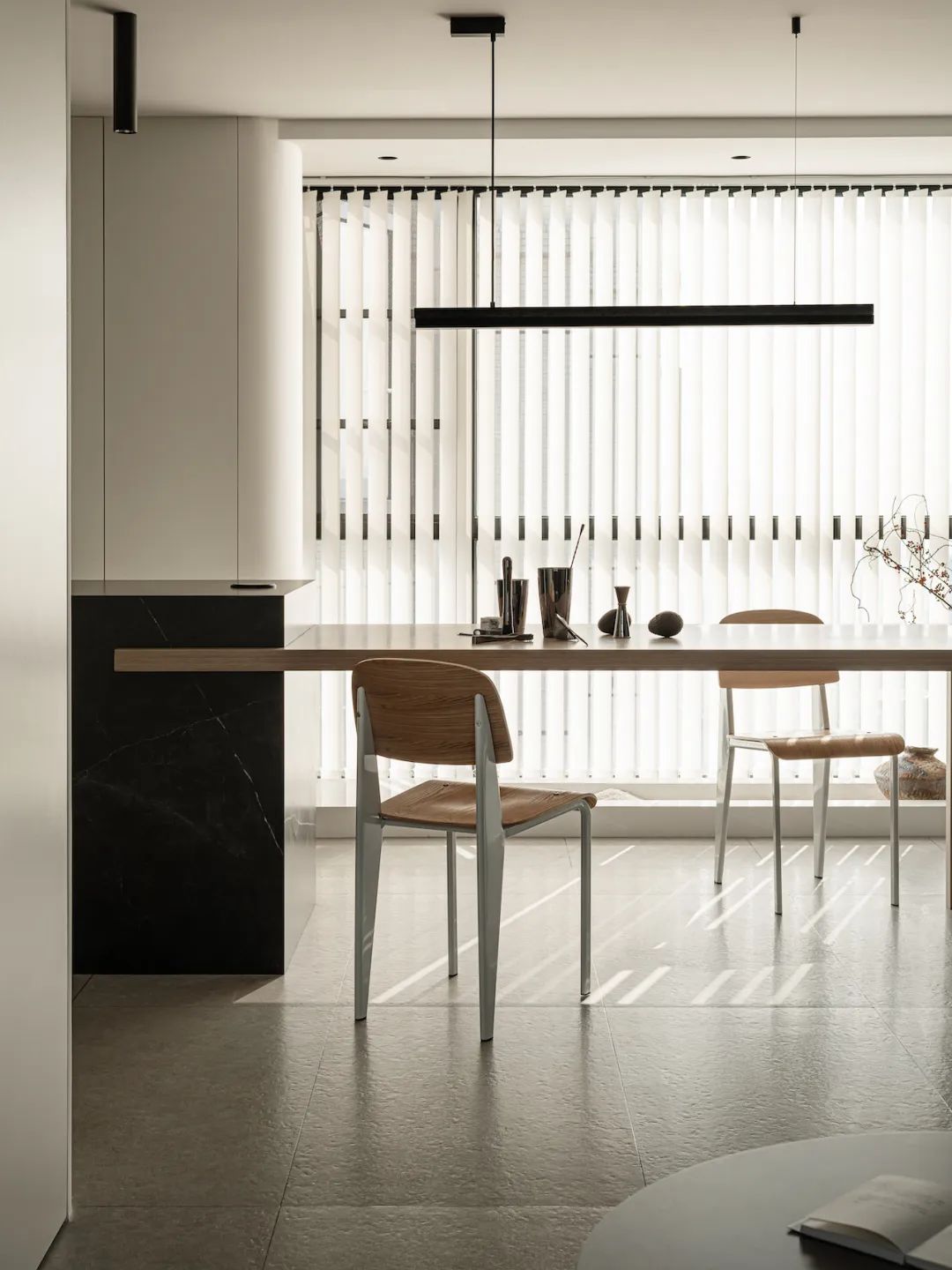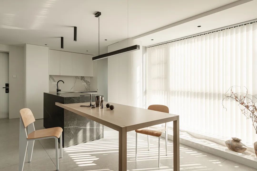 廚房的設計延續極簡的風格,白色的櫥櫃與黑色島台相搭配,兼具美觀性與實用性,細膩的紋理提升了整體空間的質感。利落的線條爲空間帶來極緻舒适的感受,簡潔的色彩高級又耐看。