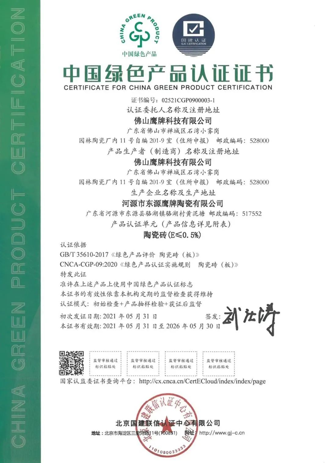 一直以來,陶瓷一線品牌華鵬陶瓷注重穩産與低碳發(fā)展并重轉變,從生産基地檢測原材料、生産過(guò)程及産品屬性,經(jīng)過(guò)嚴格的檢測和考核,榮獲由國(guó)家市場監督總局批準的認證機構頒發(fā)的“中國(guó)綠色産品認證”證書,華鵬陶瓷産品被認定爲綠色、健康、環保、高品質認證。