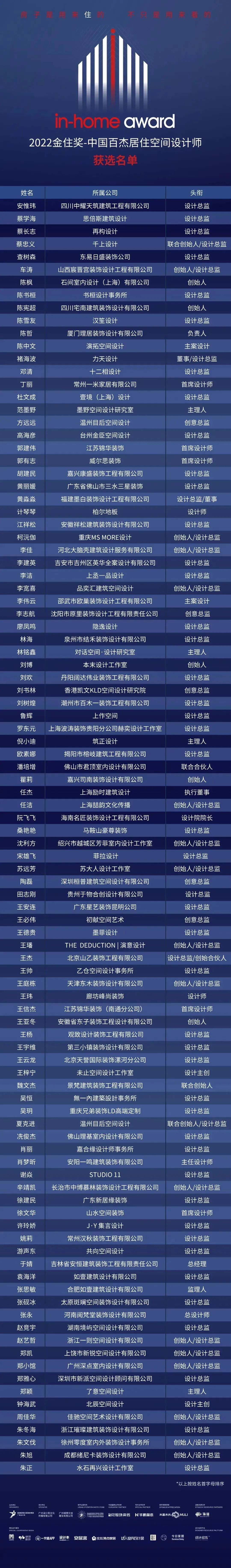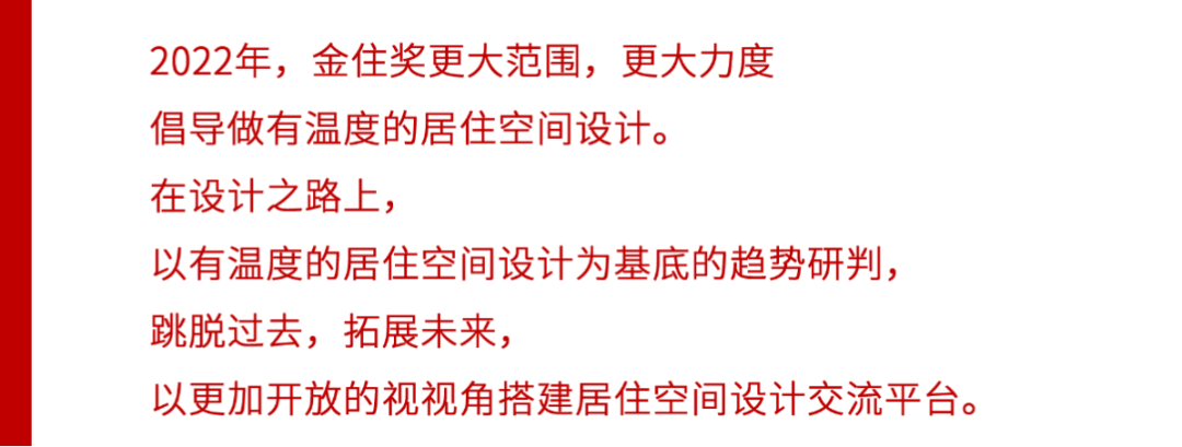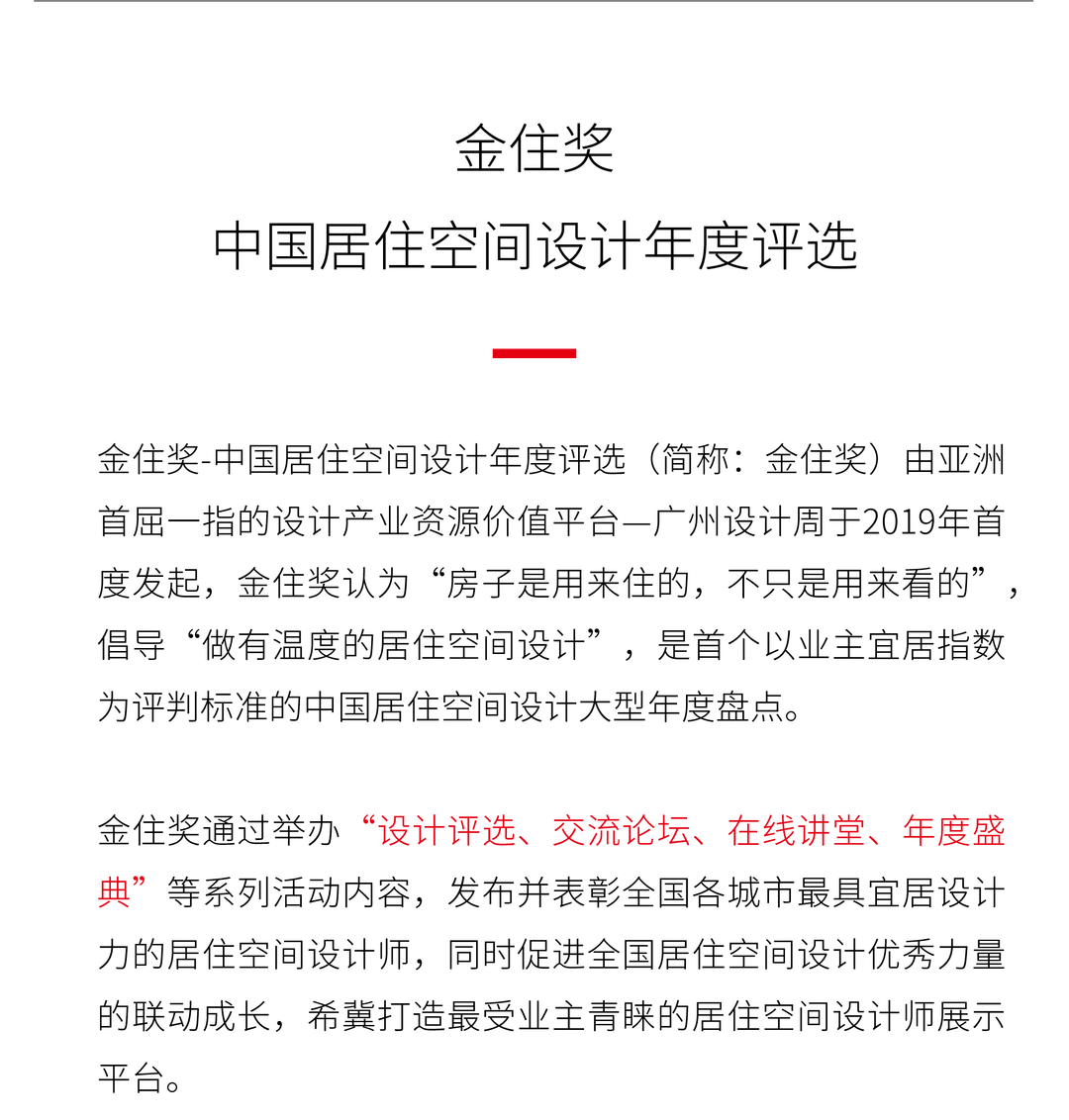 金住獎-中國(guó)居住空間設計年度評選(簡稱:金住獎)由亞洲首屈一指的設計産業資源價值平台—廣州設計周于2019年首度發(fā)起(qǐ),金住獎認爲“房子是用來住的,不隻是用來看的”,倡導“做有溫度的居住空間設計”,是首個以業主宜居指數爲評判标準的中國(guó)居住空間設計師大型年度盤點。