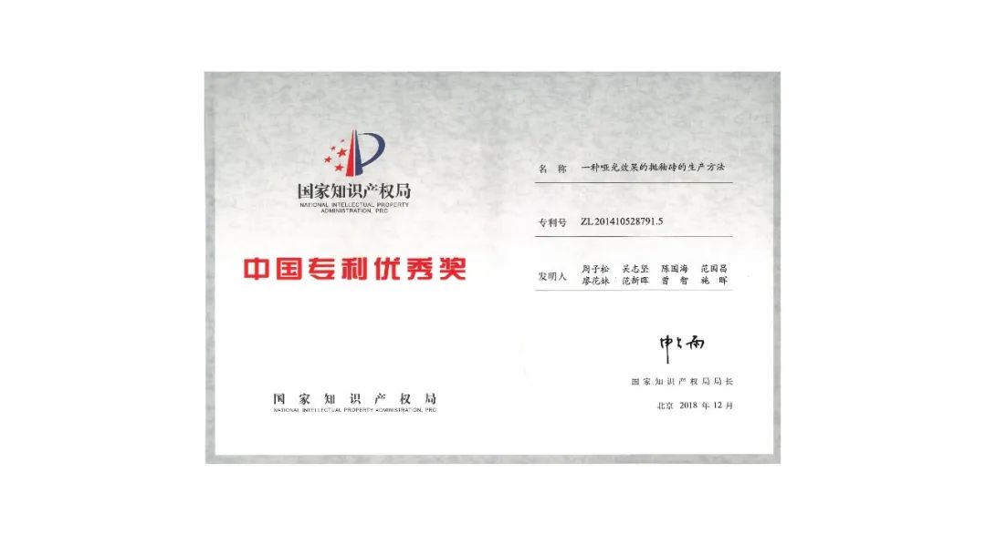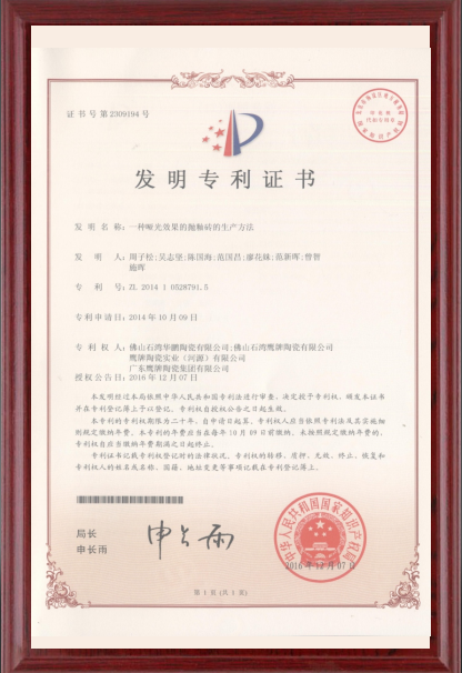 2013年,華鵬陶瓷敏銳的捕抓到消費者需求的變化。在滿足瓷磚基本功能(néng)需求上,把健康舒适列爲重點考慮的因素,研發(fā)出自己獨有的29°柔光瓷磚。并且在2016年,榮獲國(guó)家發(fā)明專利技術。