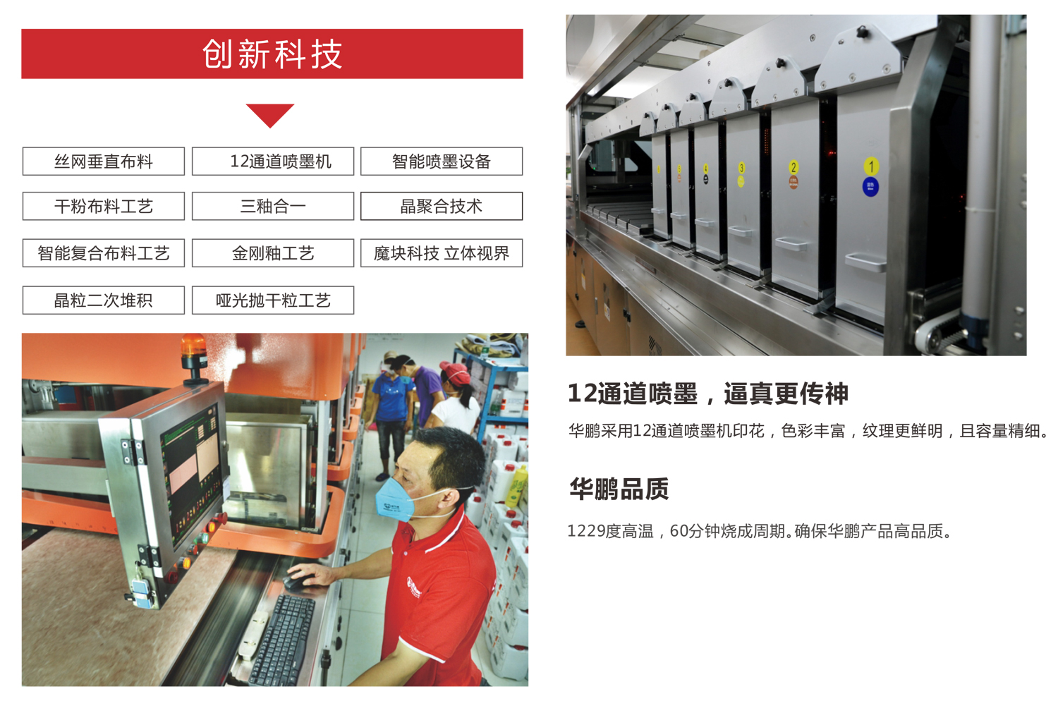 華鵬擁有柔光磚體系、高耐磨一次燒微晶玉體系、白磚體系、微粉顆粒磚體系等四大特色産品。